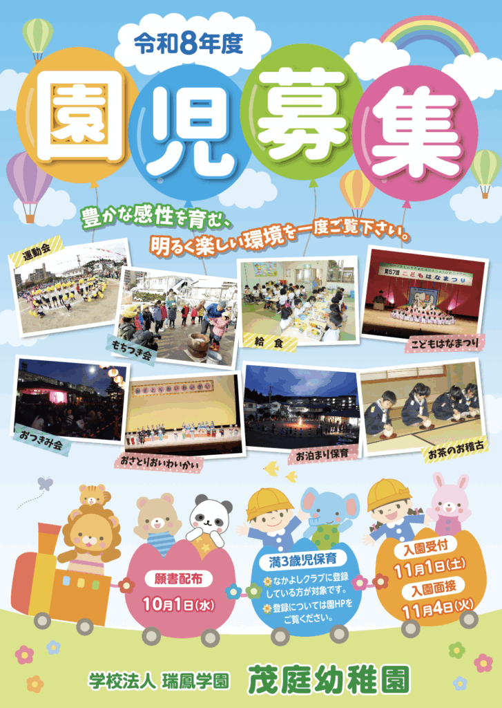当園では、令和8年度の入園募集を以下のスケジュールで行います。ご質問などございましたら、お気軽にお問い合わせ下さい。
