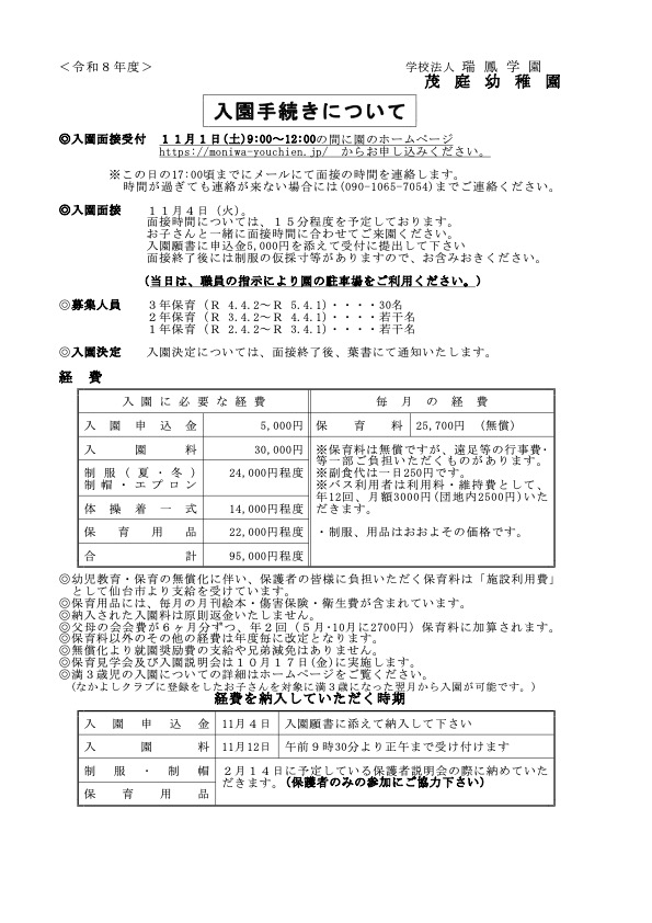- 入園願書配布開始: 10月1日 〜 10月31日