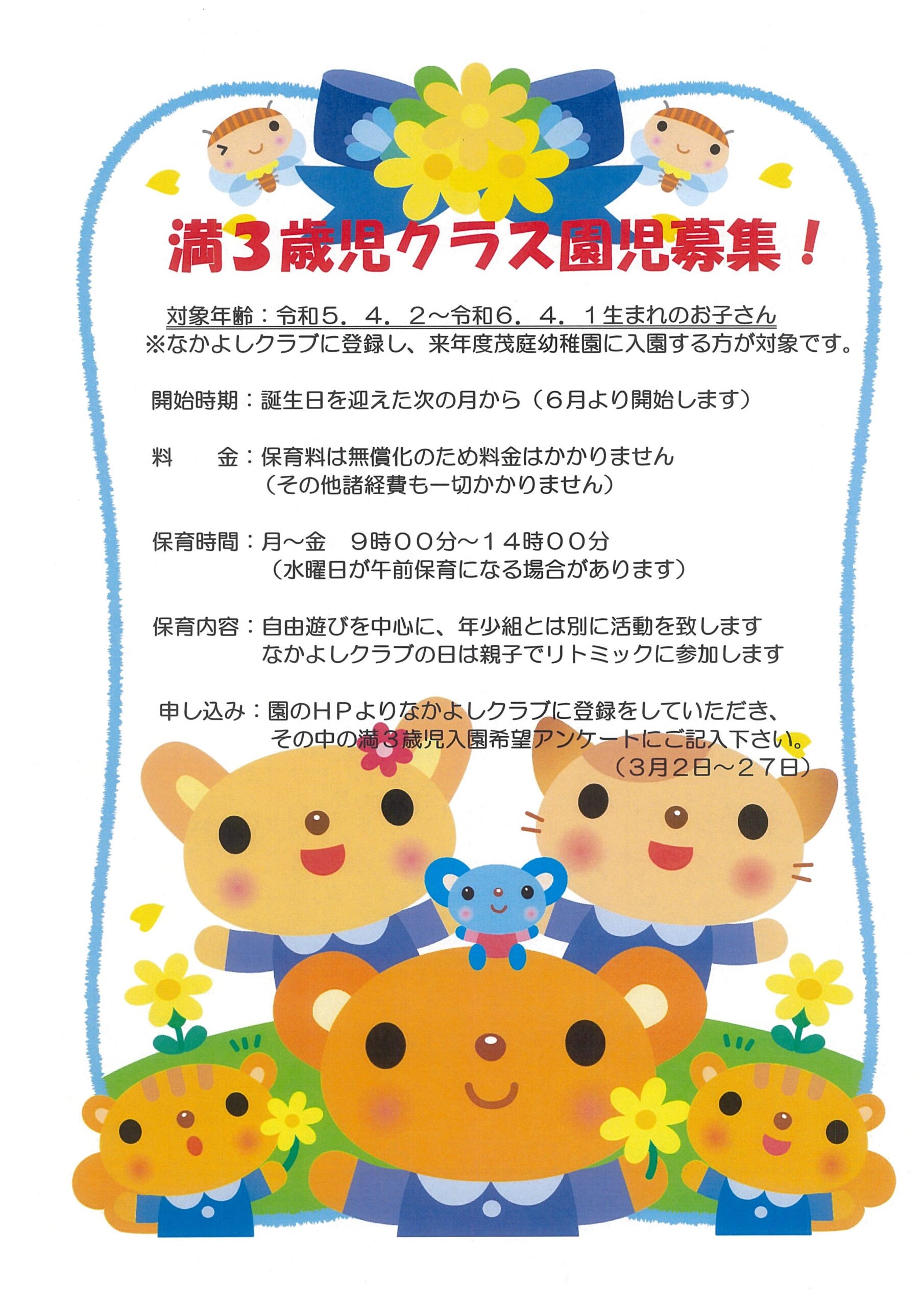 ・満3歳児の説明会は、なかよしクラブの第1回目(2026年5月13日)の同日に開催を予定しております。